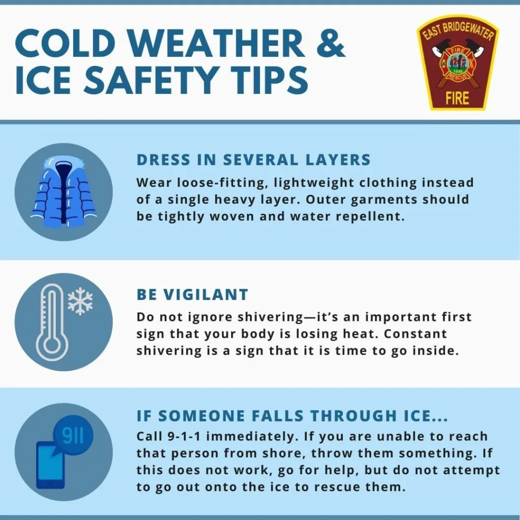 Chief Timothy Harhen and the East Bridgewater Fire Department would like to provide cold weather and ice safety tips to residents during the winter months.