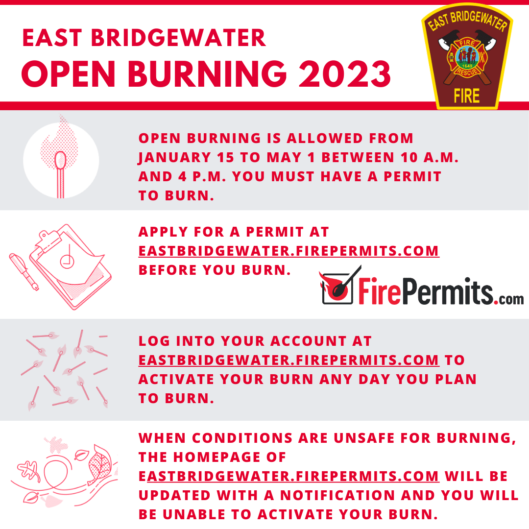 Residents can begin applying for a burn permit today by creating an account via the department’s burn permit portal: eastbridgewater.firepermits.com. There is no cost for a burn permit.