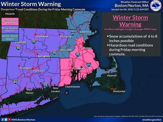 At this time, the National Weather Service (NWS) is predicting hazardous weather conditions with current snow accumulations forecast to reach 6-8 inches through Friday morning. In addition, the area is under a Winter Storm Warning from 1 a.m. – 7 p.m. Friday. Gusty winds and isolated power outages are possible, as well as freezing roads. According to the NWS, travel may be difficult to impossible during the Friday morning commute.