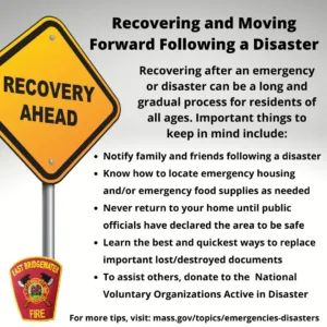 EAST BRIDGEWATER — In the event of an emergency or natural disaster, Fire Chief and Emergency Management Director Timothy Harhen would like to provide East Bridgewater residents with information and tips to assist them in recovering and moving forward.