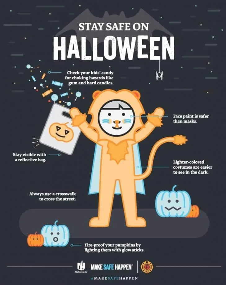 - Pedestrian injuries are very common on Halloween. Remind kids to stay in a group. They should walk on sidewalks whenever possible, or on the far edge of the road facing traffic. Crosswalks should be used whenever possible and children should always look both ways before crossing the street.